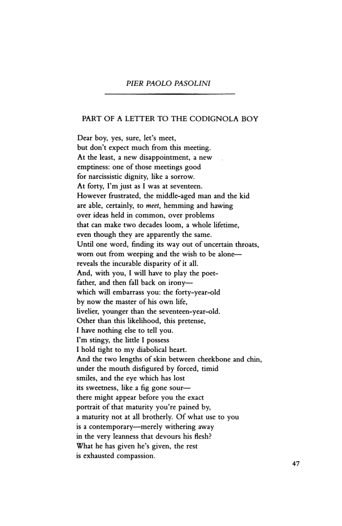 “Pazolini je očigledno na svoj način shvatao komunizam i marksističko nasleđe. Nije verovao u „progres“, glavnu pretpostavku zvaničnog marksizma, ali i cele antikapitalističke opozicije. Polazio je od nečeg očiglednog i iskustvenog: od ogromnog bogatstva prekapitalističke i nekapitalističke tradicije, od te velike „istorije stilova“ – životnih, umetničkih, intelektualnih, duhovnih, zanatskih, izražajnih. Valjda bi upravo marksisti, kao protivnici kapitalizma, trebalo da pokažu najviše sluha za to nasleđe i taj potencijal? Za sve što je lokalno, komunalističko, autonomno, nemonetarno, egalitarno, bratsko, čak i ako ostaje „tehnološki zaostalo“? Valjda su odnosi u kojima želimo da živimo važniji od materijalnih uslova? I kao da ti odnosi ne bi, nužno, kreirali sopstvenu materijalnu sferu, zaista „primerenu čoveku“? Ali, levica je sanjala nešto drugo: kapitalizam; isti, stari materijalistički san, s nekim slabašnim amandmanima.”