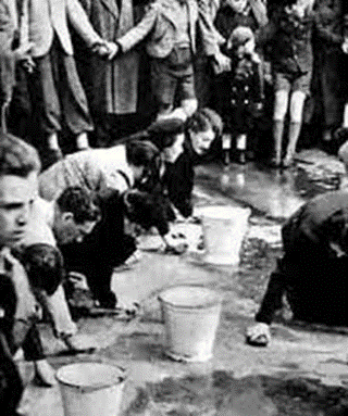 Glasovi su pripadali momčićima između dečačkog i mladićkog doba, dečacima što mutiraju i govore altom, dubokim ženskim glasom. Dvadesetak ljudi je bilo razvrstano u tri reda, a pred svakim redom su stajale po tri metalne kofe. Ljudi su klečali i nešto radili. Prišavši bliže, Oto je video da u rukama drže krpe i četke. Prali su ulicu.