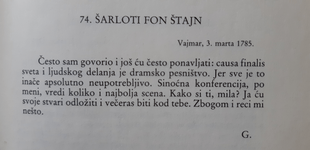 A u stvari, htela sam samo da kažem da čitam Geteova pisma i da, uopšte, treba čitati Getea.